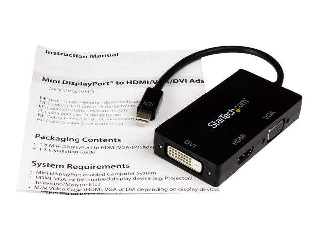 StarTech.com 3 in 1 Mini DisplayPort Adapter - 1080p - Mini DP / Thunderbolt to HDMI / VGA / DVI Splitter for Your Monitor (MDP2VGDVHD) - Videoadapter - Mini DisplayPort han til HD-15 (VGA), DVI-D, HDMI hun - 27 cm - sort - aktiv, 1920 x 1200 (WUXGA) support - for P/N: DKT31CMDPHPD MDP2VGDVHD