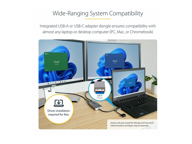 This USB to dual HDMI adapter enables the addition of two independent HDMI displays (1x 4K & 1x 1080p) to your computer, using a single USB Type-A 3.2 Gen 1 (5 Gbps) connection.