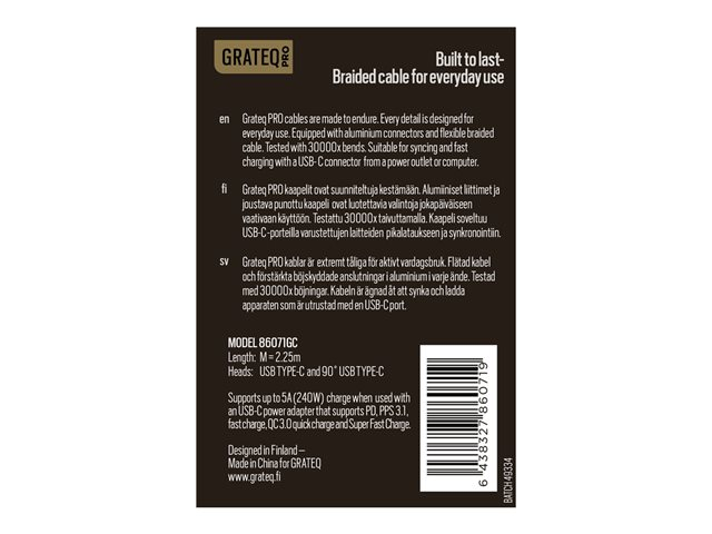 Oplev funktionaliteten af GRATEQ PRO USB-C-kablet fra ALLit Oy, der er designet til effektiv strømforsyning og dataoverførsel. Dette kabel har en 24-bens USB-C-stik i hver ende, hvilket giver problemfri tilslutning, uanset om du oplader eller synkroniserer enheder. Med understøttelse af hurtig opladning og Quick Charge 3.0 kan brugerne nyde hurtig genopladning, hvilket øger produktiviteten og enhedens brugervenlighed. Det unikke 90° vinklede design minimerer belastningen på forbindelsen, mens den holdbare flettede konstruktion sikrer pålidelighed over tid.