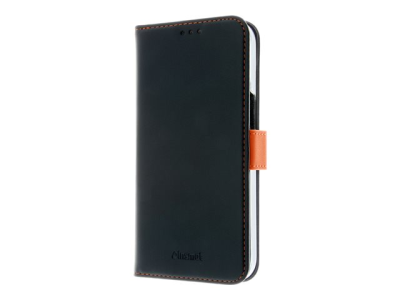 Insmat Exclusive - Flipomslag til mobiltelefon - ægte læder, polykarbonat, karton+papir+aluminiumsfolie - sort, orange - for Apple iPhone 15 650-3192