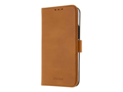 Insmat - Flipomslag til mobiltelefon - læder, polykarbonat, karton+papir+aluminiumsfolie, bomuldssyninger - brun - for Apple iPhone 14 Pro