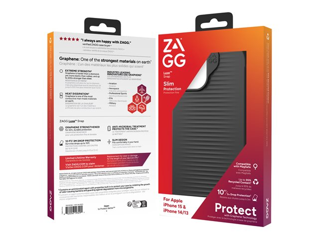 Telefonen din fortjener Luxe-behandlingen. Gå utover grunnleggende beskyttelse med Luxe Snap-dekselet fra ZAGG. Dette MagSafe-kompatible dekselet har blitt testet for å beskytte telefonen din mot fall på opptil 3 meter (10 fot). Det komfortable grepet og den myke, glatte overflaten føles godt i hånden, og den slanke designen passer lett i lommen.
