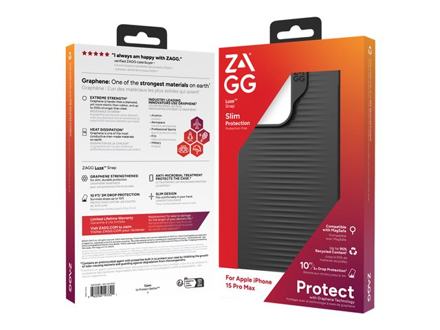 Telefonen din fortjener Luxe-behandlingen. Gå utover grunnleggende beskyttelse med Luxe Snap-dekselet fra ZAGG. Dette MagSafe-kompatible dekselet har blitt testet for å beskytte telefonen din mot fall på opptil 3 meter (10 fot). Det komfortable grepet og den myke, glatte overflaten føles godt i hånden, og den slanke designen passer lett i lommen.