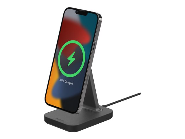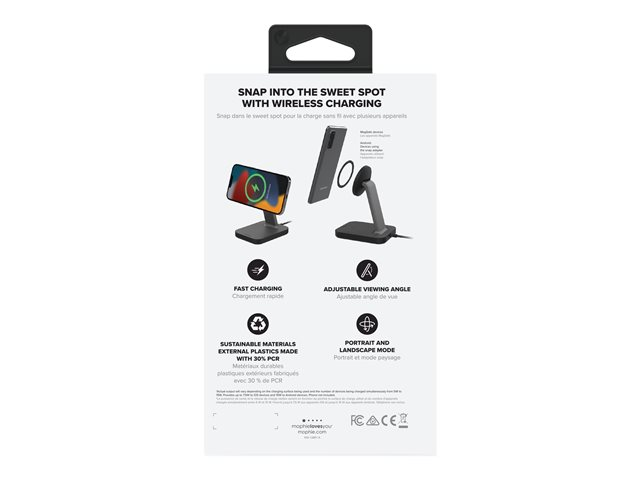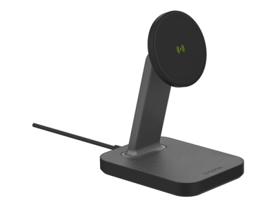 Oplev helt nye muligheder for opladning. Den MagSafe-kompatible snap+ opladningsstander holder din telefon oprejst, mens den trådløst forsynes med op til 7,5 til 15 W. Der medfølger også en adapter, som gør det muligt for telefoner, der ikke er kompatible med MagSafe, at blive fastgjort til standeren magnetisk. Din telefon placeres med det samme det rigtige sted og starter opladningen ved kontakt. snap+ opladningsstanderen holder din telefon over rodet på dit skrivebord, så du kan videochatte, se film eller læse beskeder, mens din telefon oplader.