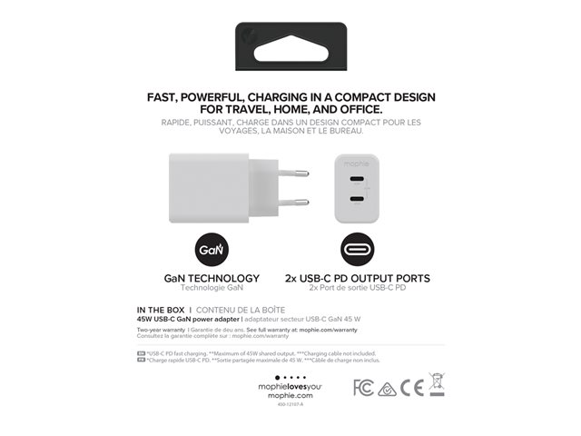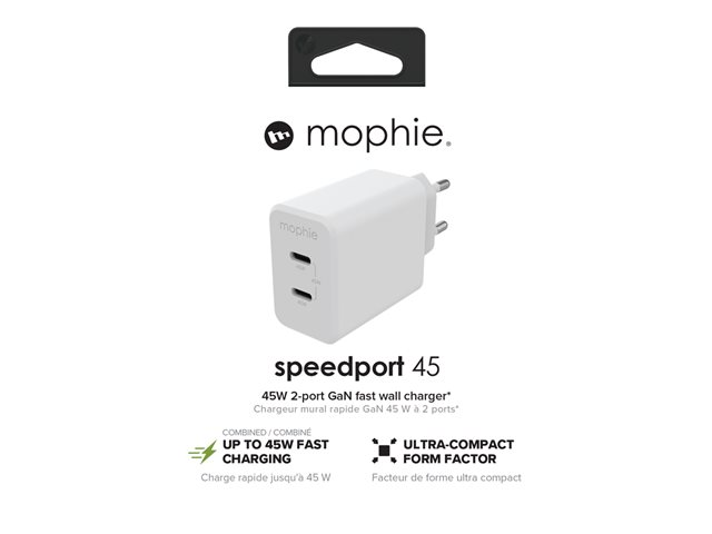 Oplad hurtigere! Speedport 45 leverer et maksimalt delt output på op til 45 W til din telefon, tablet og andre digitale enheder. Med to USB-C-porte kan du oplade to enheder på én gang. GaN-teknologi øger opladningseffektiviteten og hastigheden, så du får en masse kraft i en ultra kompakt pakke.