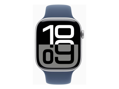 Apple Watch Series 10 (GPS) - 46 mm - sølvaluminium - smart ur med sportsbånd - fluoroelastomer - denim - båndstørrelse: S/M - 64 GB - Wi-Fi 4, UWB, Bluetooth - 36.4 g MWWL3QN/A