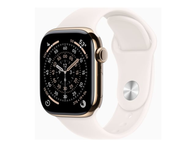 Apple Watch Series 11 (GPS + Cellular) - 42 mm - guld titanium - smart ur med sportsbånd - fluoroelastomer - lyserød - båndstørrelse: S/M - 64 GB - Bluetooth, LTE, Wi-Fi 4, UWB - 5G - 34.6 g MF8W4QN/A