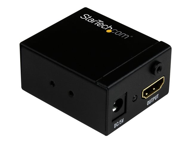Amplify the strength of your HDMI signal to extend your video source up to 115 ft. over standard HDMI cable. This HDMI signal booster lets you increase the signal strength of your HDMI video source so you can connect an HDMI display up to 115 ft. (35 m) away, using standard HDMI cables. You can place the booster inline between two HDMI cables, up to 82 ft. in length at the video input, and up to 33 ft. in length at the video output.