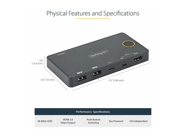 StarTech.com 2 Port Hybrid USB-A + HDMI & USB-C KVM Switch, Single 4K 60Hz HDMI 2.0 Monitor, Compact Desktop and/or Laptop HDMI KVM Switch, USB Bus Powered, Thunderbolt 3 Compatible - 2 Port HDMI KVM Switch (SV221HUC4K) - KVM / audio-switch - 2 x KVM / audio - desktop SV221HUC4K