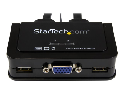 To help organize your desk without sacrificing valuable work space, this VGA USB KVM switch features a compact footprint and integrated KVM cables that can be connected directly to your systems. Plus, the KVM is USB-powered, eliminating the need for a bulky external power adapter and wall outlet.