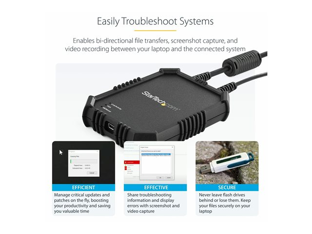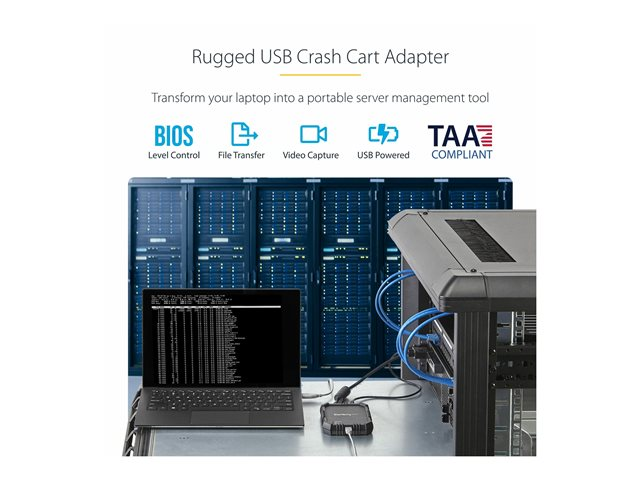 Use this USB crash-cart adapter to turn your laptop into a portable KVM console for accessing servers, ATMs and kiosks with file transfer and video capture. This rugged and portable USB crash cart adapter lets you turn your laptop into a portable console for accessing servers, desktops and laptops, as well as ATMs, kiosks or any computing device that features both VGA and USB ports.