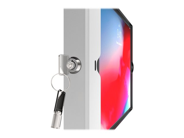 The Space iPad Enclosure features rounded edges and open corners for improved ventilation and allows for limited access to buttons and inputs. The tablet can be continuously charged while in the enclosure and have peripheral cables plugged in while mounted.