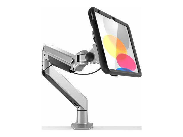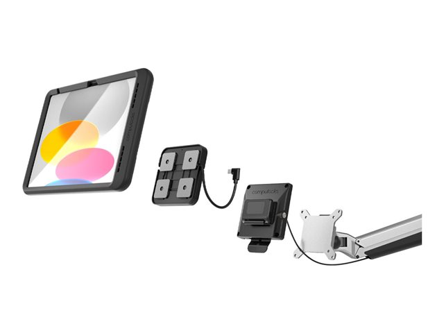 Allows data and power transfer through USB-C interface, locking mechanism for tablet security, "lift to release" mechanism, integrated kickstand on tablet side, extending flexible arm and cable-free charging.