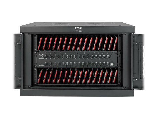 Eaton Tripp Lite Series 32-Device USB Charging Station Cabinet er en omfattende opladningsløsning designet til smartphones og andre USB-opladede enheder. Dette alsidige skabssystem kan placeres på et skrivebord eller monteres på en væg, hvilket gør det ideelt til klasseværelser, kontorer og detailmiljøer. Med 32 USB 2.0 A-opladningsporte er det muligt at oplade flere enheder samtidigt, så de altid er klar til brug. Skabet er bygget med en strømafbryder for ekstra sikkerhed og har en robust stålkonstruktion, der gør det holdbart og sikkert. Den sorte pulverlakerede finish øger ikke kun holdbarheden, men giver også et elegant, professionelt look. Ladestationen er designet med brugervenlighed for øje og har et kabelhåndteringssystem, flytbare skillevægge for nem organisering og hurtig opladning. Derudover har den avancerede sikkerhedsfunktioner som overopladnings- og overstrømsbeskyttelse samt EMI- og RFI-filtrering for at forhindre elektrisk interferens under opladning. Med sine omfattende funktioner og sit holdbare design er Eaton Tripp Lite Series-ladestationen et vigtigt værktøj til at holde enhederne opladede, organiserede og sikre.