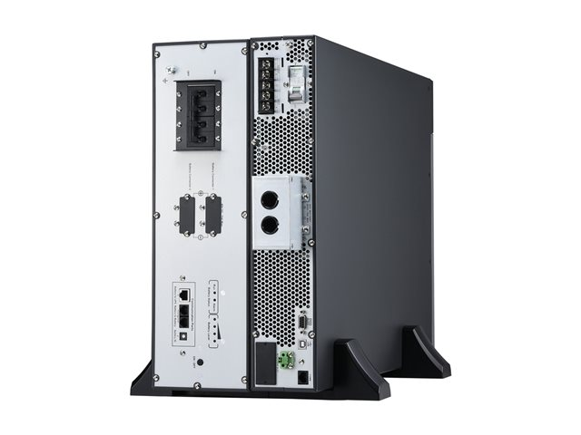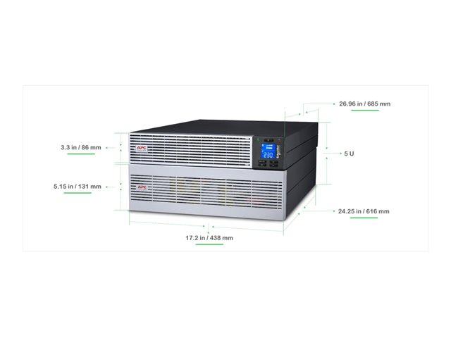 APC Easy UPS On-Line - UPS (stativ-monterbar / ekstern) - forlænget driftstid, hårdwire tilslutning (1P+N+E), intelligent kortslot, med skinnekit - AC 230 V - 6 kW - 6000 VA - Litiumion - RS-232, USB, RJ-11, RJ-45 - 5U - sort, sølv (forreste ramme) - for P/N: AP9544, SRVSMB001, VGL9901I