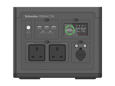 Schneider OffGrid 730 - Transportabel strømstation - LCD, 2 BS1363 stik, sinuskurve, 3 USB-A, 2 USB-C, trådløs oplader - AC 190 - 265 / DC 12 -30 V - 700 Watt - Litiumion - 738 Wh - output-stikforbindelser: 2 - United Kingdom - sort, grøn PPS730-UK