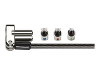 Now there's one keyed cable lock that secures it all. The Universal 3-in-1 Keyed Laptop Lock fits any laptop security slot - standard, nano, and wedge-shaped - helping to "future-proof" your locking solution. Lock tips are easily changed; a tether keeps unused lock tips handy. Common 5mm keying system, patented Hidden Pin technology, and carbon steel cable provide strong security against picking and theft attempts. Pivot and rotate lock head allows flexible movement and easy key insertion. Additional features include Register & Retrieve for quick, secure, and easy key replacement; and a warranty backed by Kensington, inventor and worldwide leader in laptop security locks. All Kensington locks are verified and tested for strength, physical endurance, and mechanical resilience.