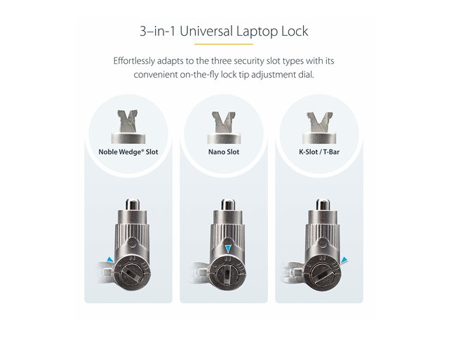 StarTech.com 3-in-1 Laptop Lock Compatible w/Noble Wedge/Nano/K-Slot - Sikkerhedskabelslås - sort og sølv - 2 m - TAA-kompatibel