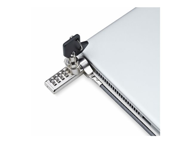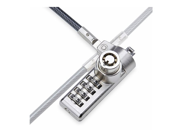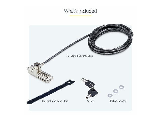 The StarTech.com 10-Pack Dual-Access Laptop Lock is a comprehensive security solution designed to protect a wide array of devices from theft. This 6.5 ft (2 m) security cable lock, compatible with all K-Slot devices, offers flexibility and security for your equipment. Whether you're securing docking stations, monitors, notebooks, or printers, this lock has you covered. The package includes 10 laptop security locks, 10 hook-and-loop straps, 30 lock spacers, and 4 keys, providing everything needed for immediate setup. With the option of using a key or combination lock, it offers dual-access flexibility, making it perfect for environments where multiple users need access. The robust construction of steel and plastic ensures your devices are protected in any setting, making it an ideal choice for educational institutions, offices, and tech labs looking to safeguard their investments.